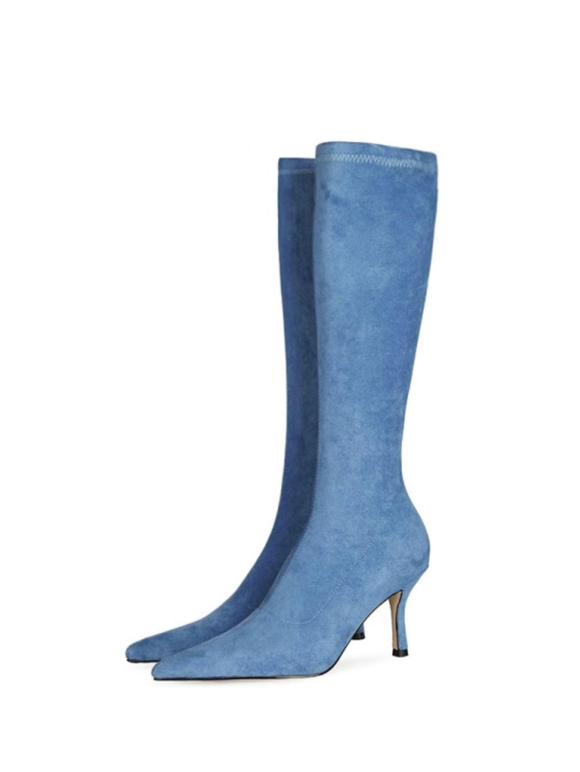 The Sky Blue Lycra High-Heel Long Boots for Women feature a sophisticated design crafted from stretchable lycra that elegantly contours to the leg. With a sleek stiletto heel and convenient slip-on style, these boots combine refined height and effortless wear, making them an elegant choice for polished, modern looks.