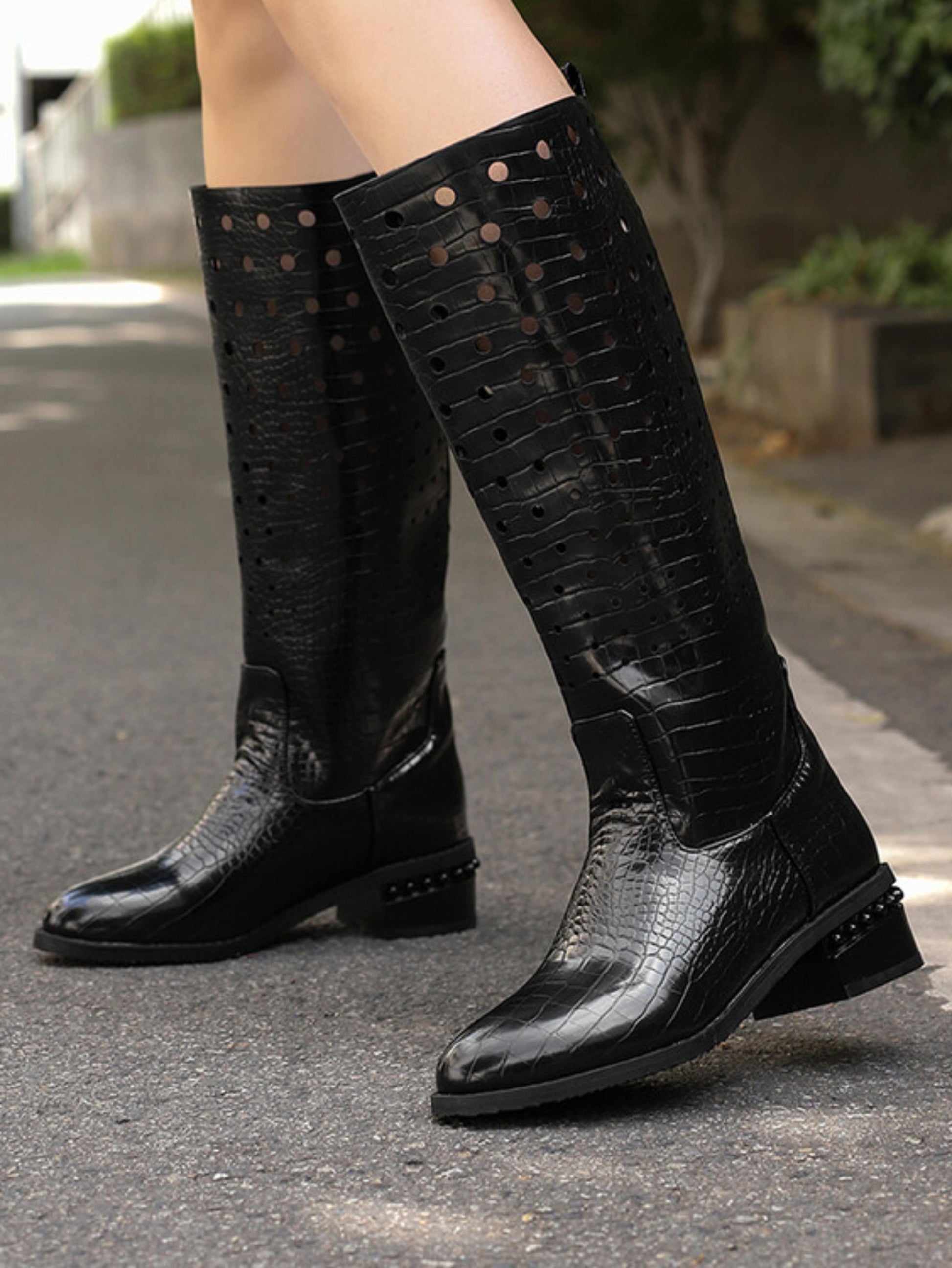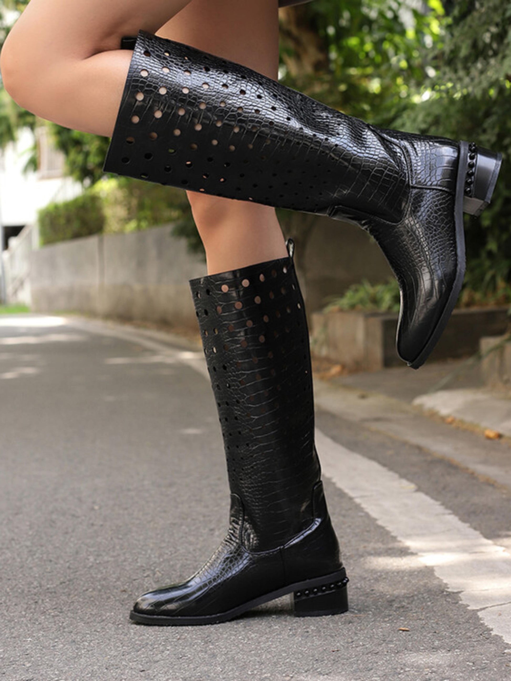 Sleek Hollow-Out Embossed Black Knee-High Boots