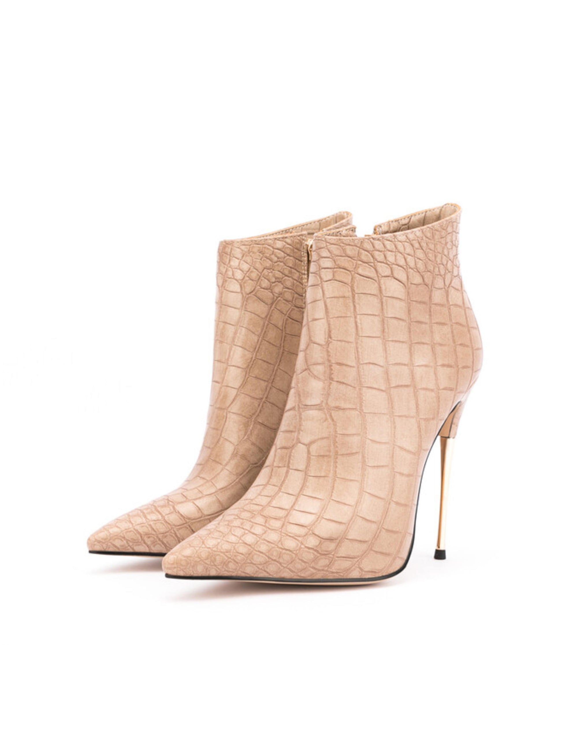 Make a fearless fashion statement with these tan croc-embossed ankle boots. Crafted from textured faux leather, they boast an ultra high stiletto heel that commands attention. The sleek side zipper offers a flawless fit, while the bold croc pattern adds an edgy touch. Perfect for those who dare to stand out.