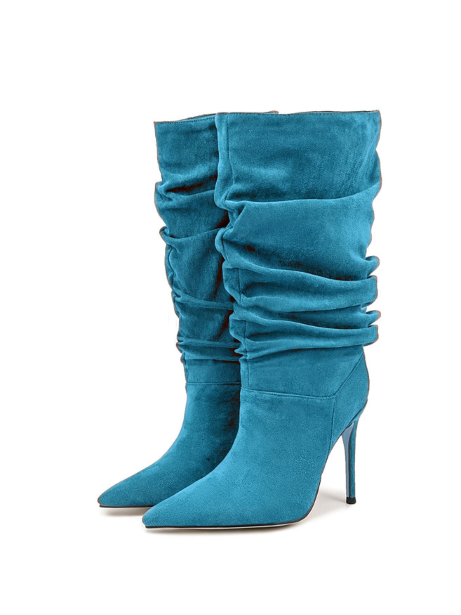 Step into standout style with these Teal Blue Mid-Calf Boots crafted from soft slouchy suede. Featuring a sharp pointed toe and ultra-high stiletto heel, they offer a striking silhouette that commands attention. The convenient slip-on design ensures effortless wear, making these boots the perfect choice to elevate any outfit with bold confidence.