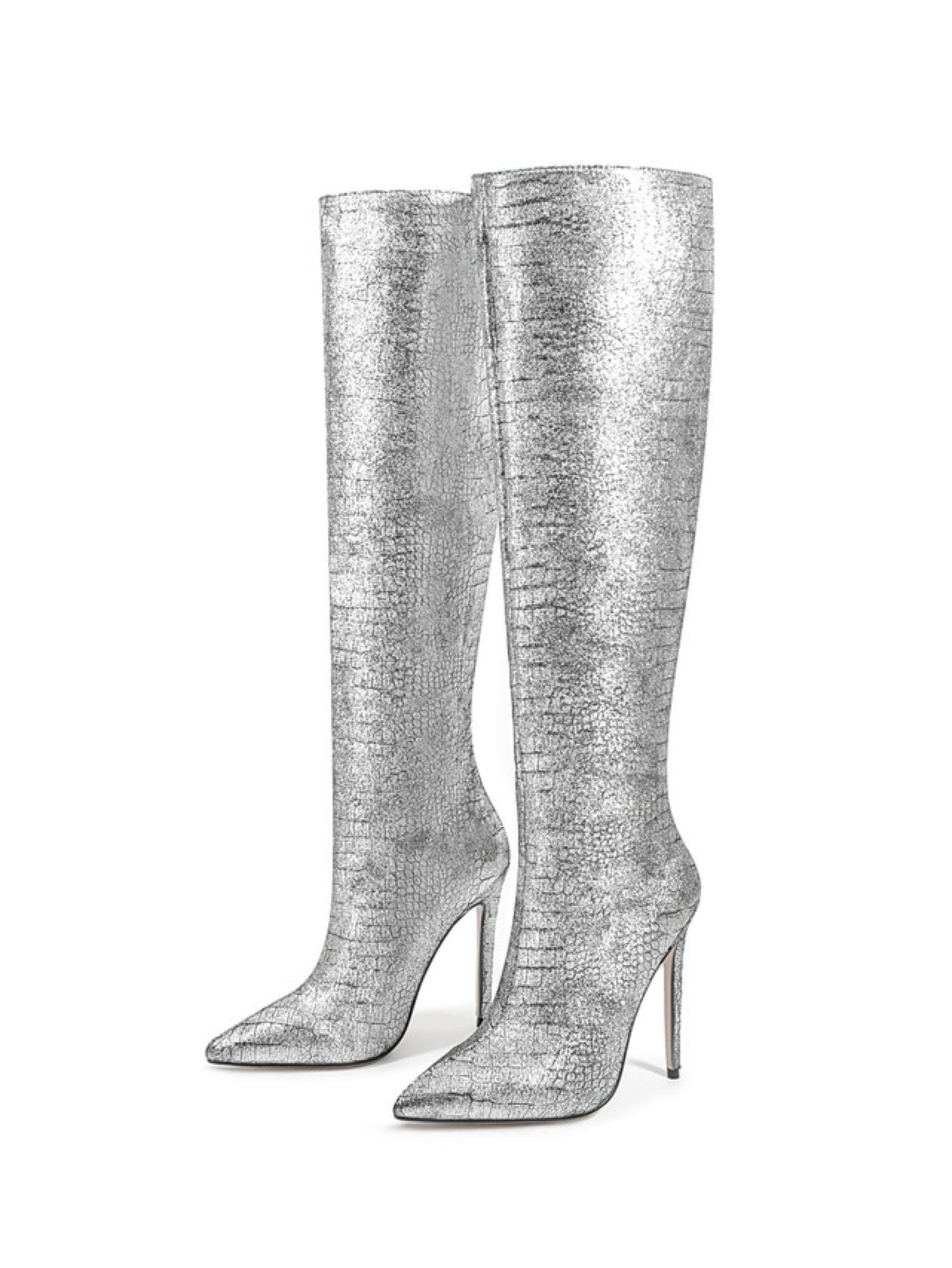 Trendy Silver Pointed Toe Embossed Tall Boots for Women