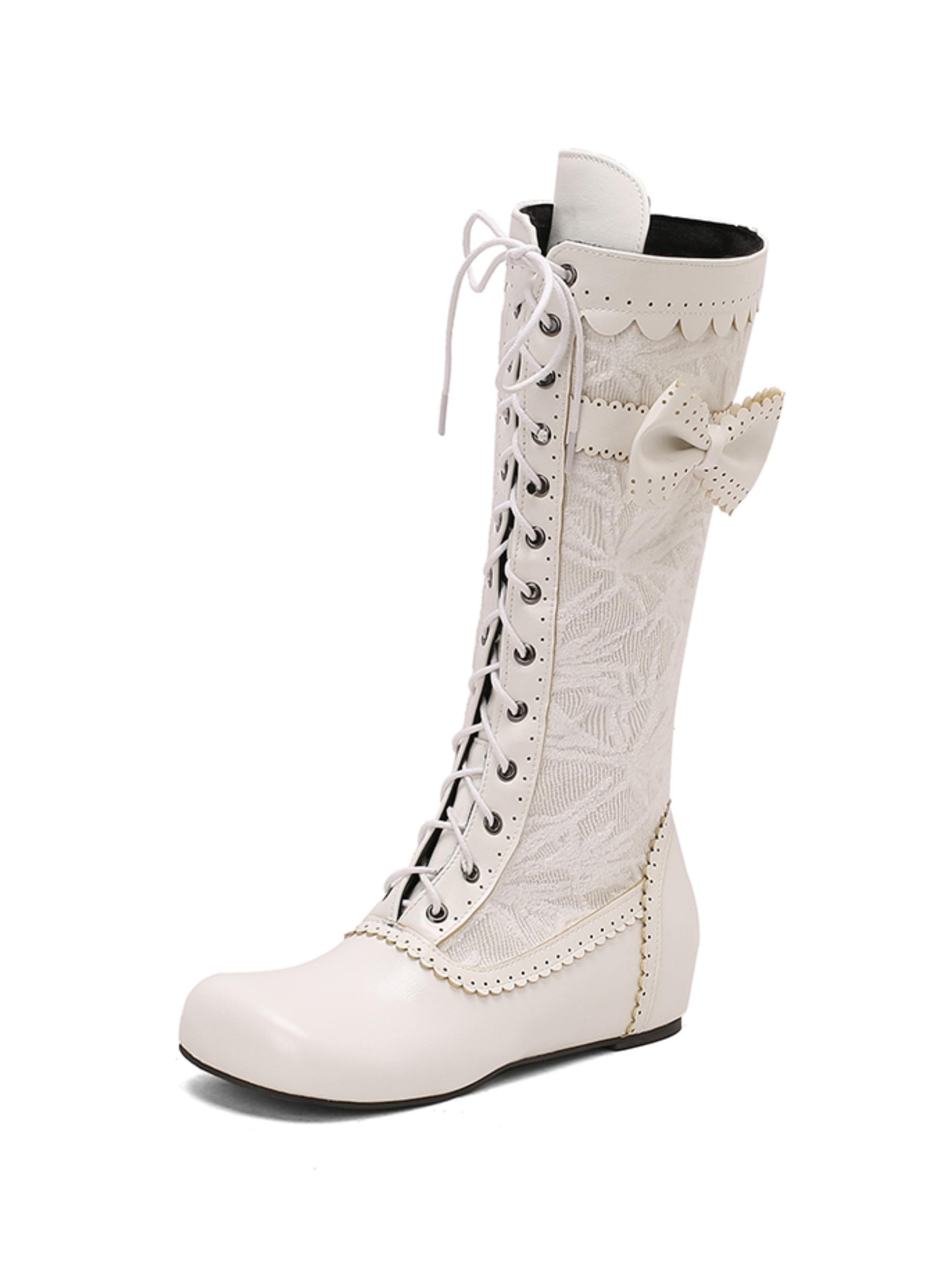 Delicate white knee-high lace-up boots featuring intricate floral lace panels and scalloped trim for a romantic, vintage-inspired look. The polished toe and low wedge heel offer comfort and subtle elegance, while a decorative bow accent adds feminine charm.
