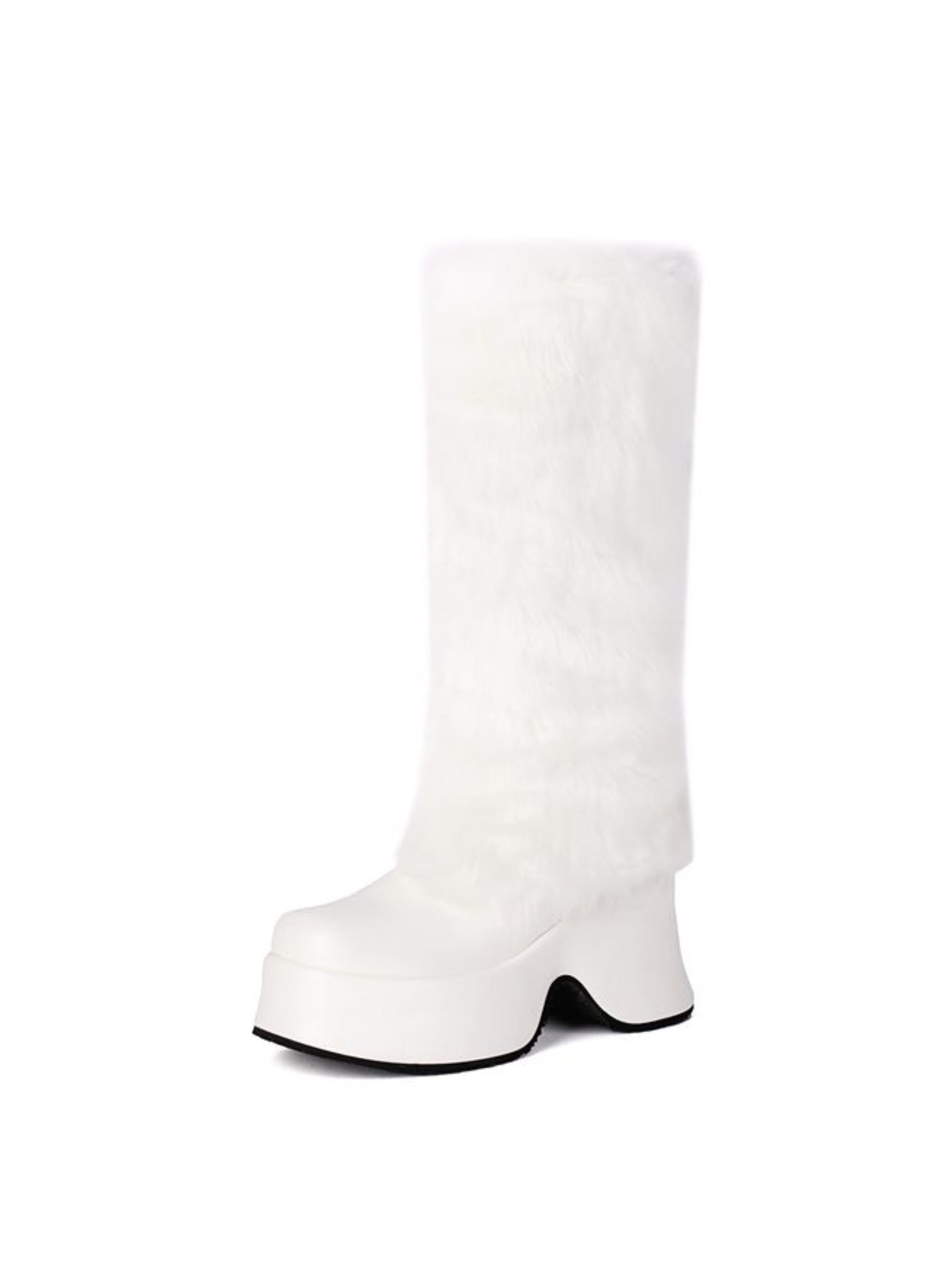 Embrace winter with confidence in these stunning white faux fur high-heel tall boots, your new go-to for cold-weather style. Built with durable faux leather and luxuriously soft faux fur, they provide the warmth and texture you need while maintaining an elegant appearance. The slip-on design makes getting ready effortless, while the square toe and platform heel offer stability and a flattering silhouette that works with your natural stride. These boots are here to support your journey through the season, keeping you comfortable and looking your absolute best every step of the way.