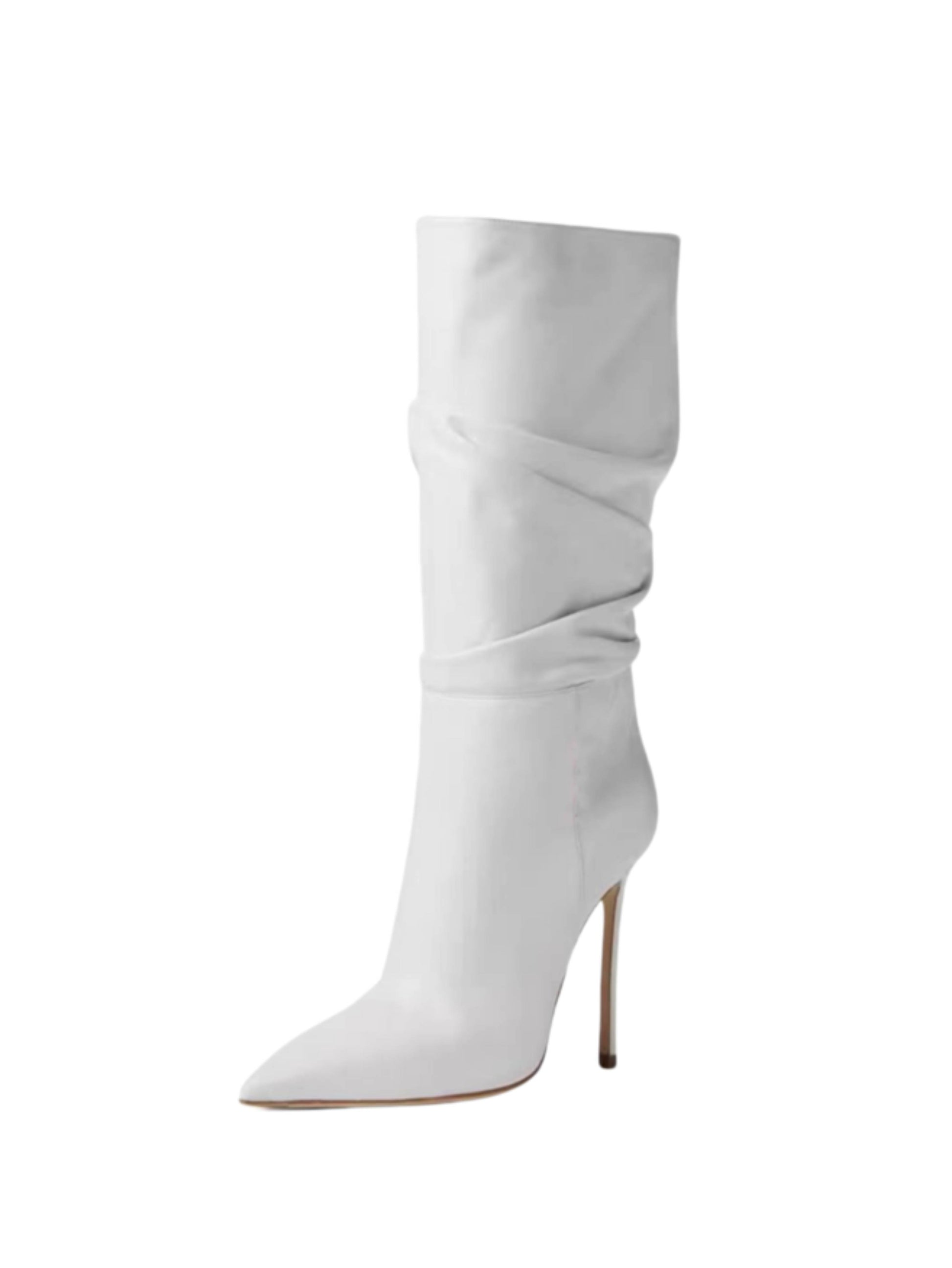 Step into sleek sophistication with these stunning white slouchy mid calf boots. Featuring a pointed toe and ultra-slim stiletto heel, they offer a striking silhouette that’s both elegant and fashion-forward. The soft, relaxed shaft adds a touch of modern ease, making them perfect for pairing with dresses, skirts, or skinny jeans for a clean, elevated look.