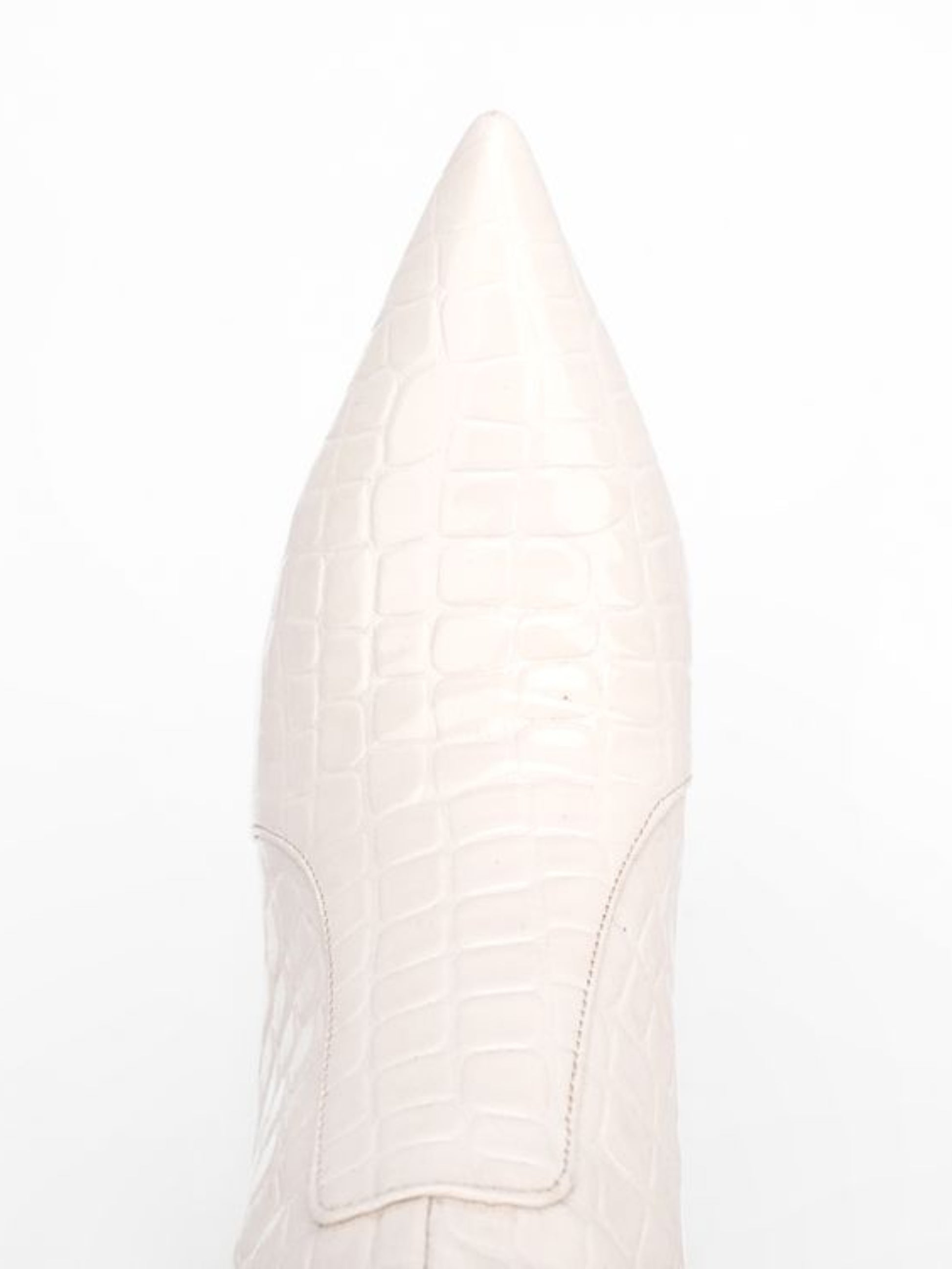 Command attention with these White High-Heel Stiletto Mid-Calf Boots, crafted from croc-embossed faux leather. Featuring a sharp pointed toe and soaring stiletto heel, their bold design is perfect for those who dare to stand out. The slip-on style combines edgy glamour with effortless wearability, making them a striking addition to any outfit.