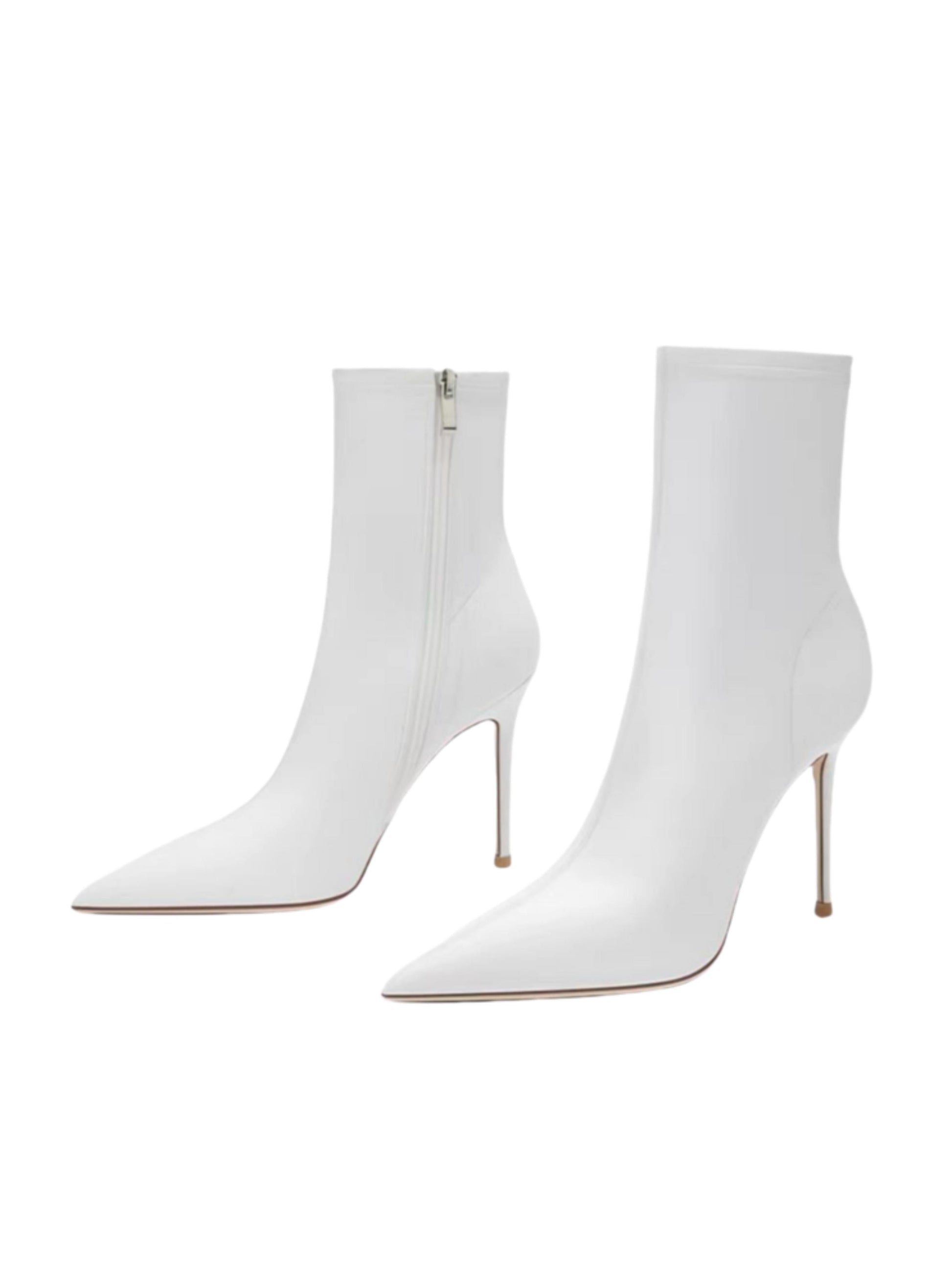 These white ankle boots capture minimalist elegance with a sleek, sculpted silhouette. Made from genuine leather, they feature a pointed toe and slender stiletto heel that elongate the leg for a refined, feminine look. The side zipper ensures easy wear, while the clean, glossy finish adds a touch of modern sophistication—perfect for elevating any outfit, from tailored pants to evening dresses..