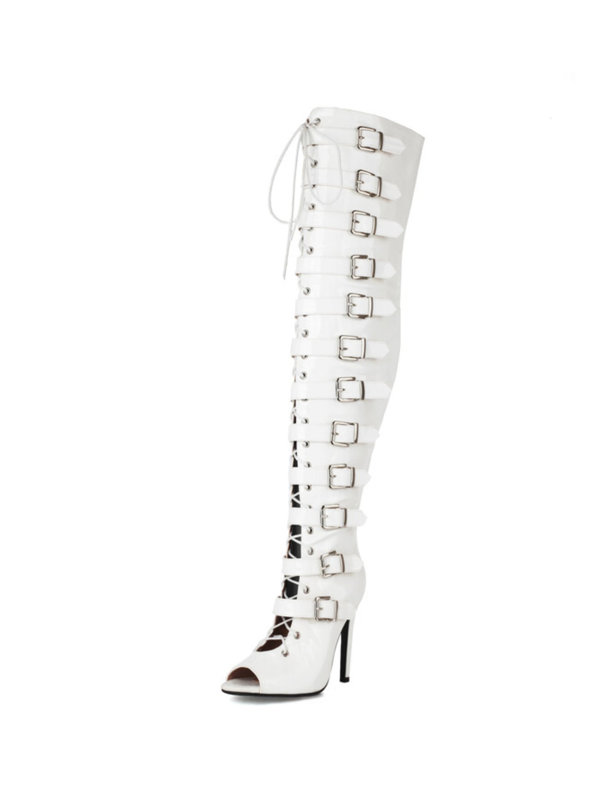 White Peep Toe High-Heel Thigh-High Buckled Boots for Women