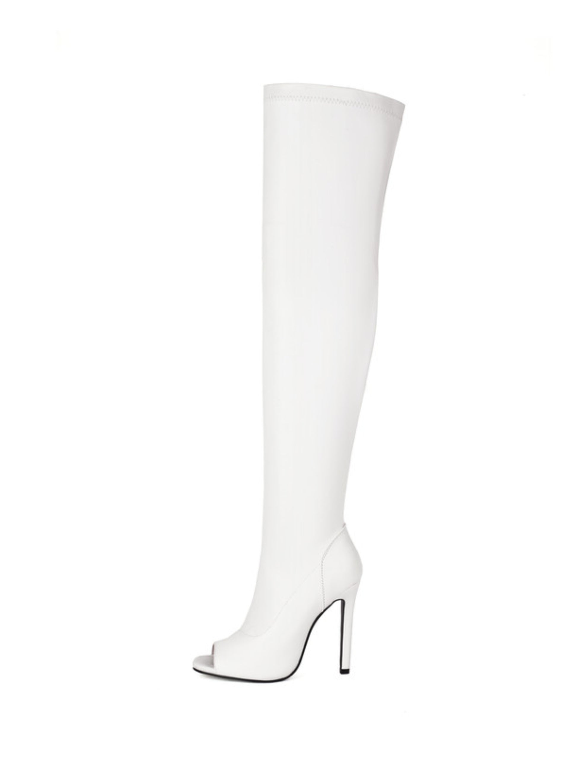 Step into sleek sophistication with these stunning white faux leather knee-high boots. Designed with a glossy finish and a daring peep-toe front, they perfectly blend elegance and boldness. The high stiletto heel elongates the legs, while the snug fit contours beautifully to your silhouette, giving any outfit a striking, runway-ready edge.