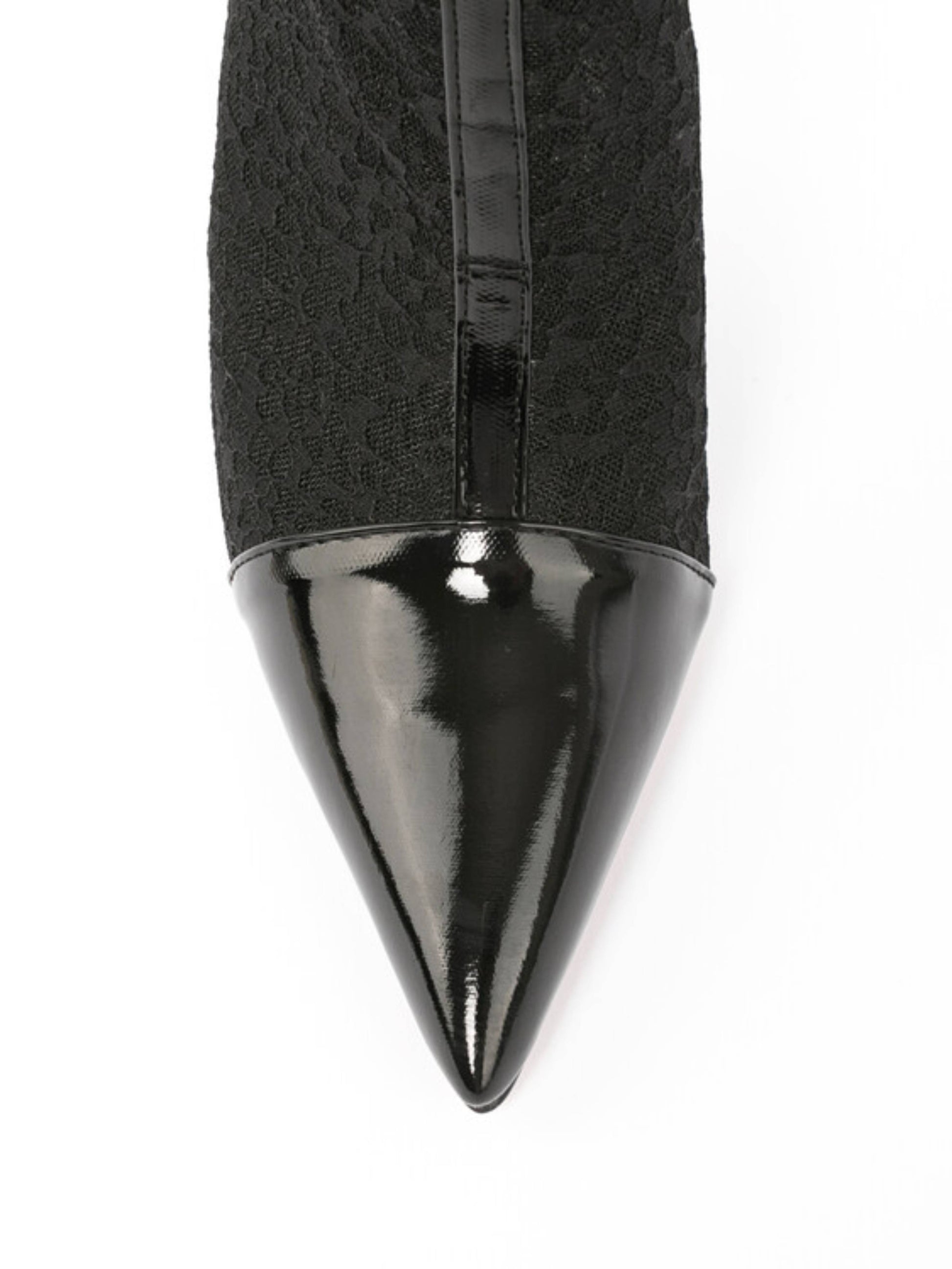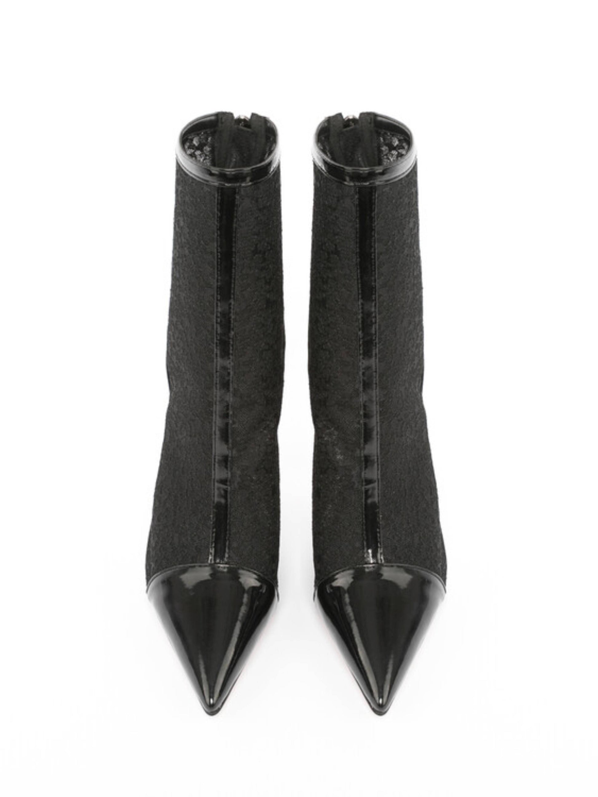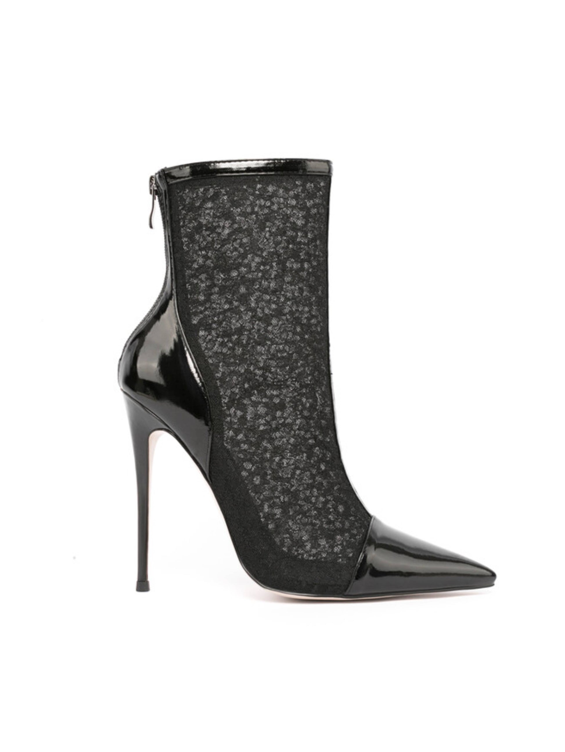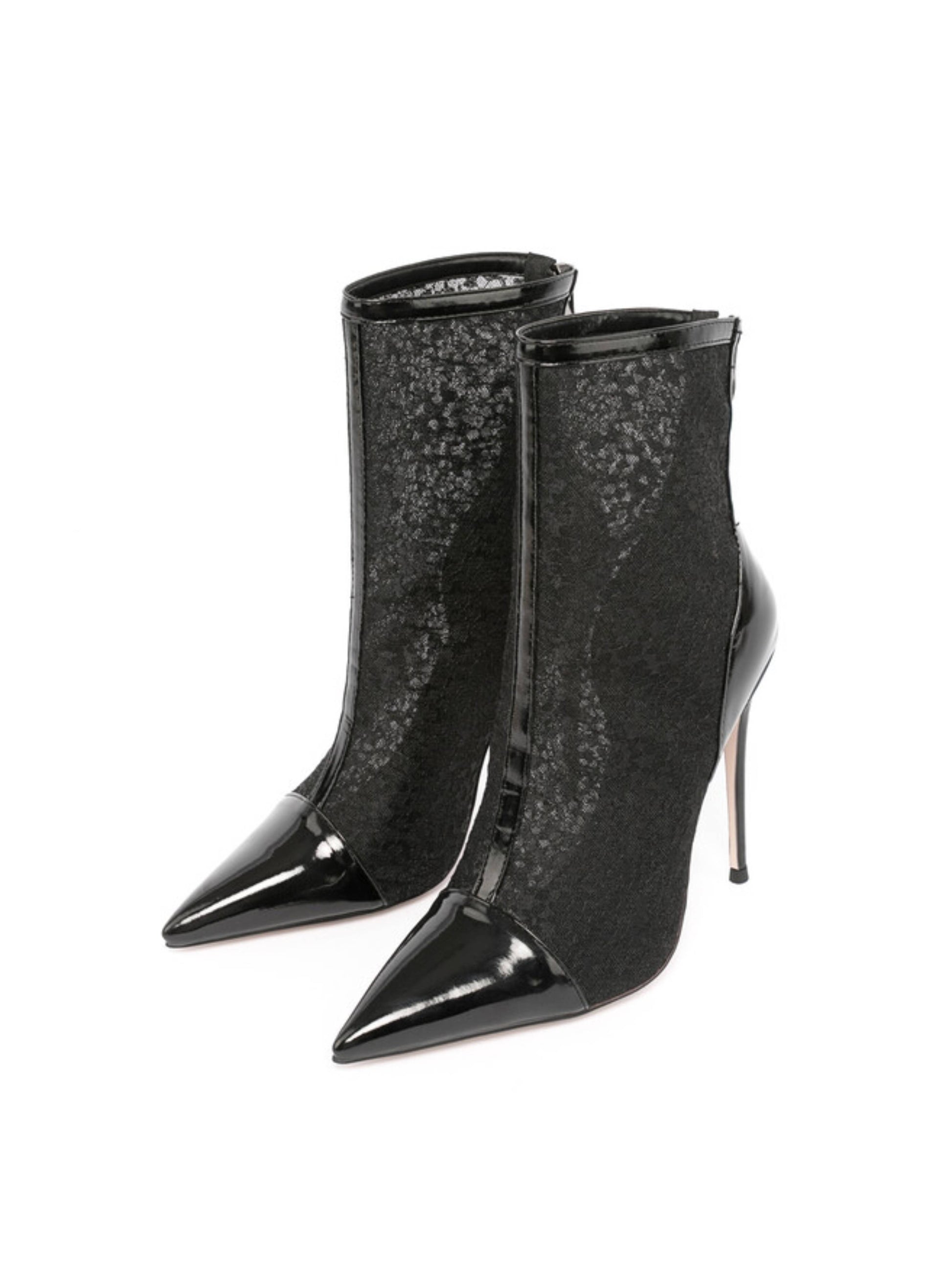 Daring and ultra-modern, these black fishnet ankle boots redefine edgy sophistication. The mesh design adds a sultry, breathable texture, while the glossy patent accents and sleek stiletto heel create a bold, high-fashion look. Perfect for nights out or statement streetwear styles.