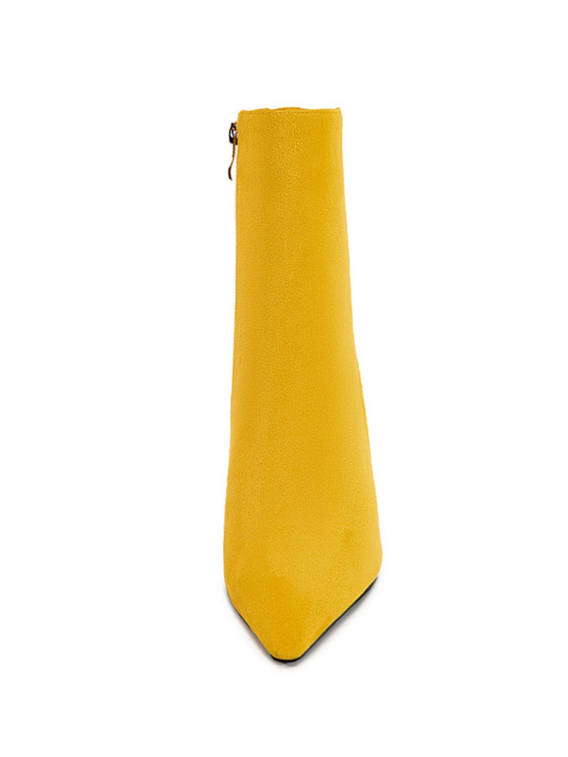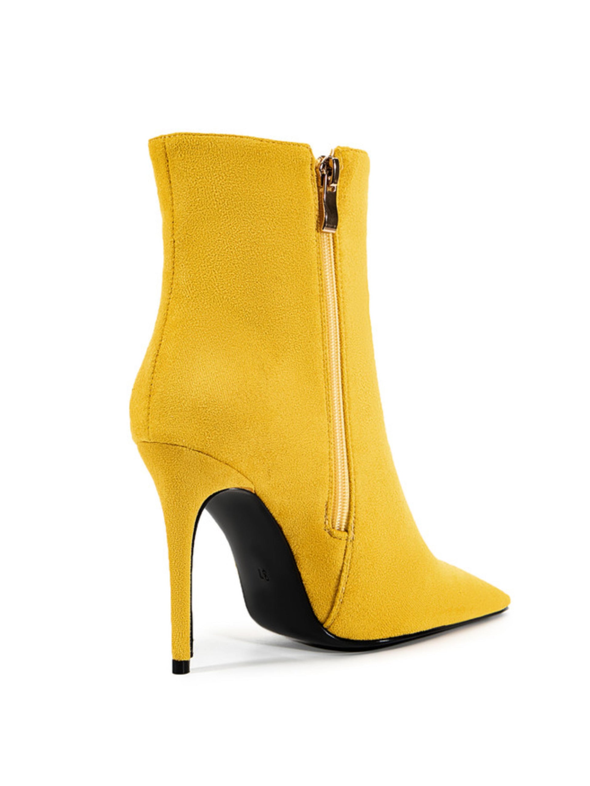 Turn heads with these striking yellow ankle boots, crafted from soft faux suede for a luxurious feel. Featuring a sleek pointed toe and a high stiletto heel, they deliver an elegant lift that enhances your silhouette. The convenient side zipper ensures a perfect fit, making these boots the ultimate choice for bold, confident style.