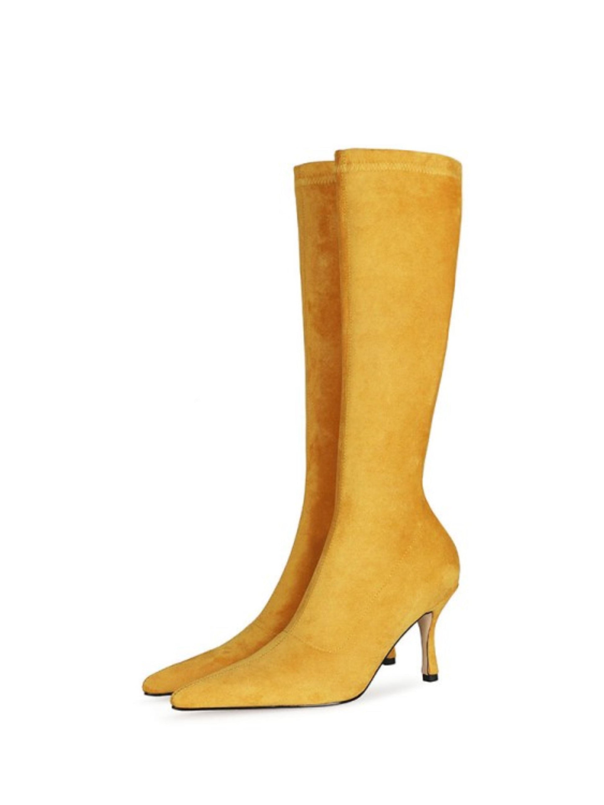 These Yellow Lycra High-Heel Mid Calf Boots for Women feature a sleek slip-on design for ease and comfort. Crafted from soft vegan suede, they offer a luxurious texture paired with a high stiletto heel that adds elegant height and a refined silhouette. Perfect for elevating your look with both style and sophistication.